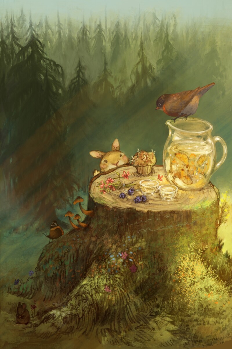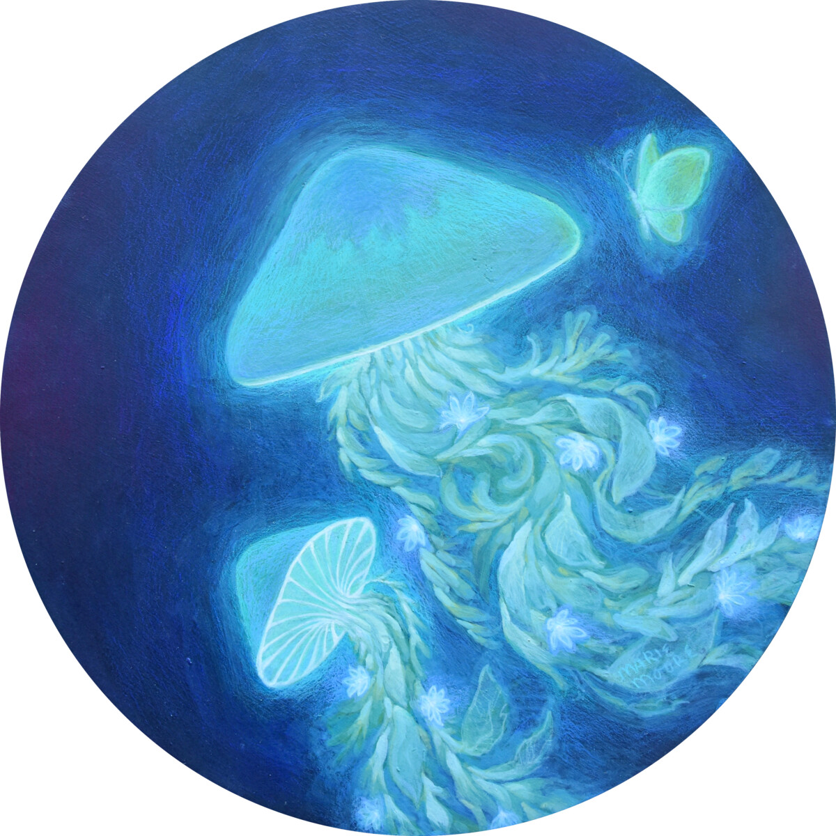 Multi-media artist Marie Moore brings you into a colourful world of magical realism. Inspired by the mystical sides of nature and science, she likes to paint narratives of connection and symbiotic relationships. Marie resonates with themes of transformation, light, and the uncovering of life’s real ‘magic’. She is drawn to many subjects but especially loves to highlight her deep connections with animals and the outdoors.